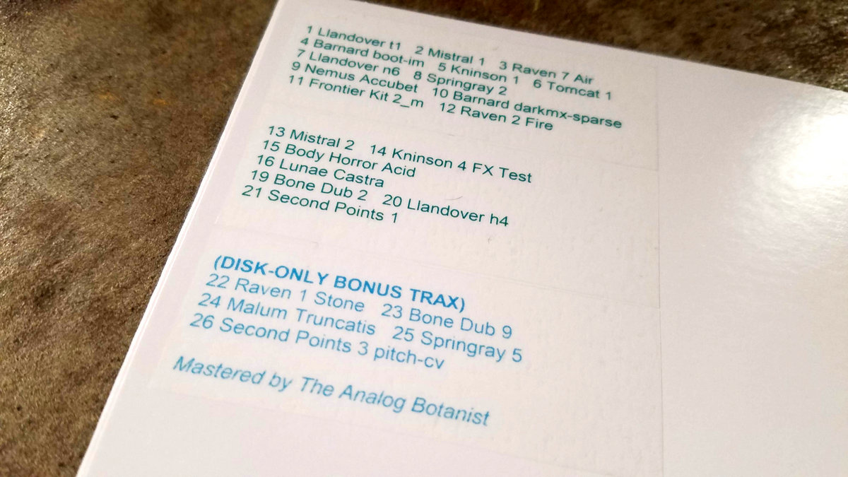 Assembled by hand, one copy at a time, in the White Pillar Workshop. A white 5" recordable disc, printed and duplicated via an Imation D20, held inside a sturdy white paperboard jacket, with custom teal text decals on the front and back cover. Ships in a clear plastic cast polypropylene sleeve, with a flap on the back side, to keep your sonic artifact dust and moisture-free. Also contains the disc-exclusive bonus tracks Raven 1 Stone / Bone Dub 9 / Malum Truncatis / Springray 5 / Second Points 3 pitch-cv for a total of 26 tracks!